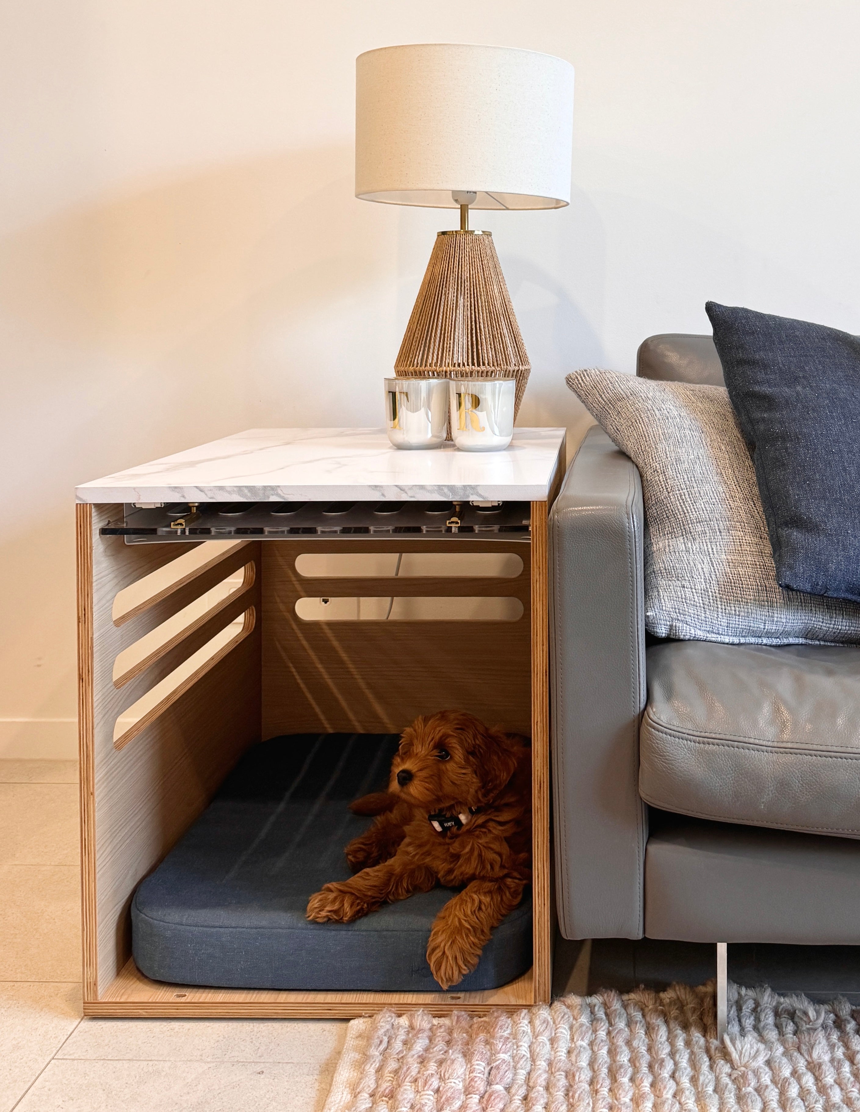 Recognising that crate training is a personal choice that varies based on your dog's needs, our crate features a hidden pocket door system. This innovative design allows it to function as both a cosy den with the door up and a chic side table for your living space.