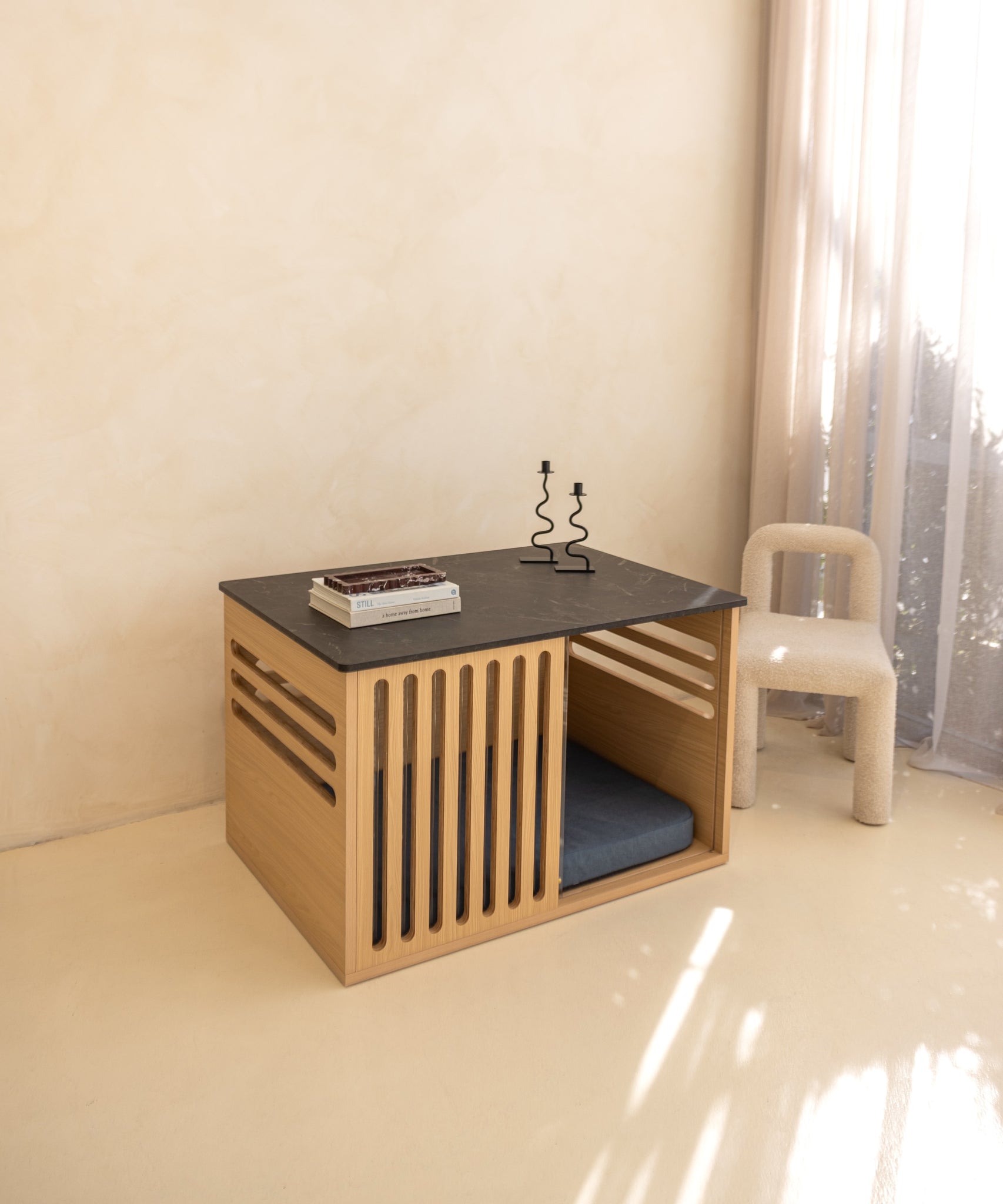 Recognising that crate training is a personal choice that varies based on your dog's needs, our crate features a hidden pocket door system. This innovative design allows it to function as both a cosy den with the door up and a chic side table for your living space.