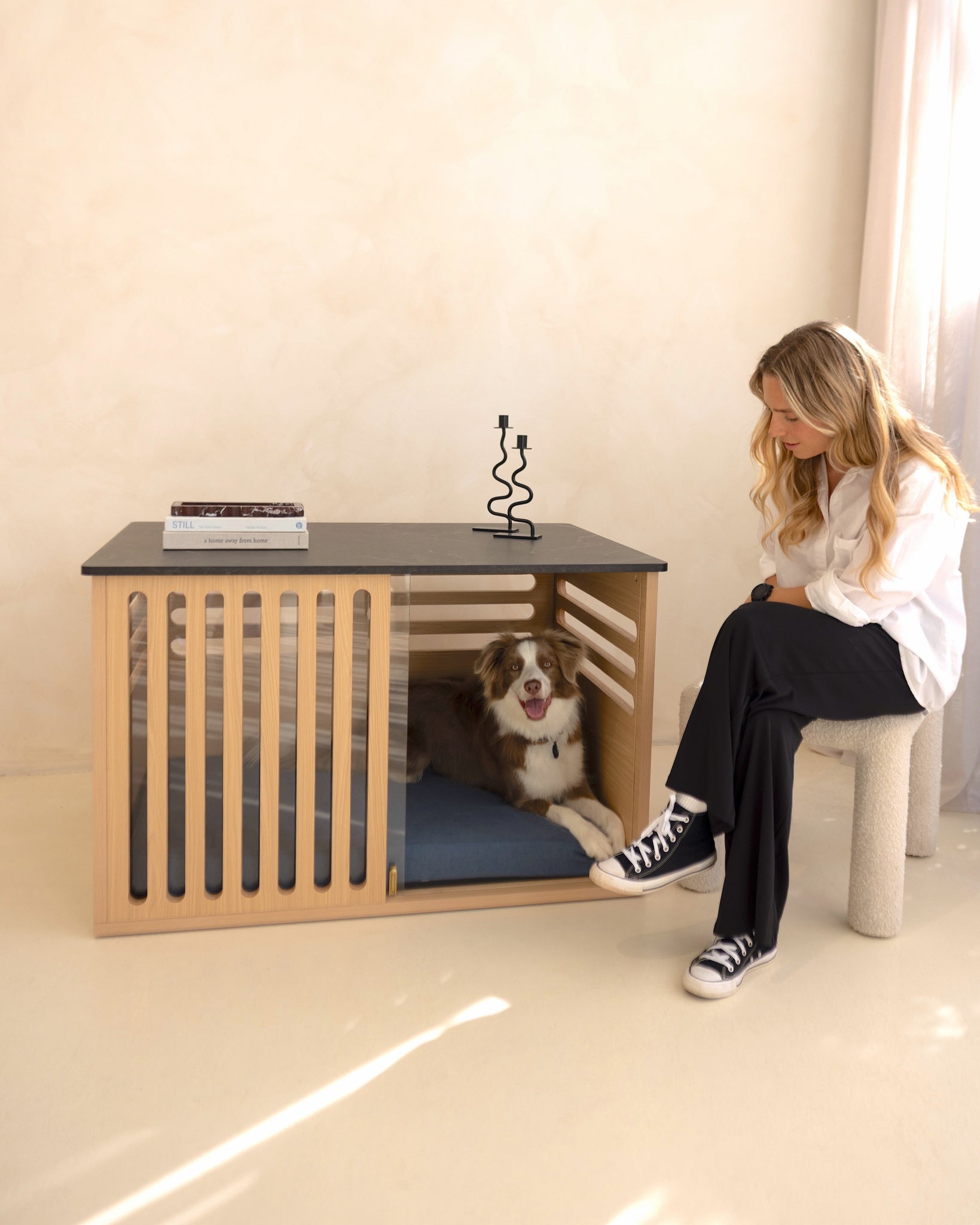 The Koozi Crate is for dog parents looking to replace mismatched crates or worn-out beds with a lasting solution that provides style, comfort and security. Designed as both a cosy, safe retreat for your dog and a stylish side table for your home, the Koozi Crate offers two essentials in one – a timeless investment you won’t want to hide away.