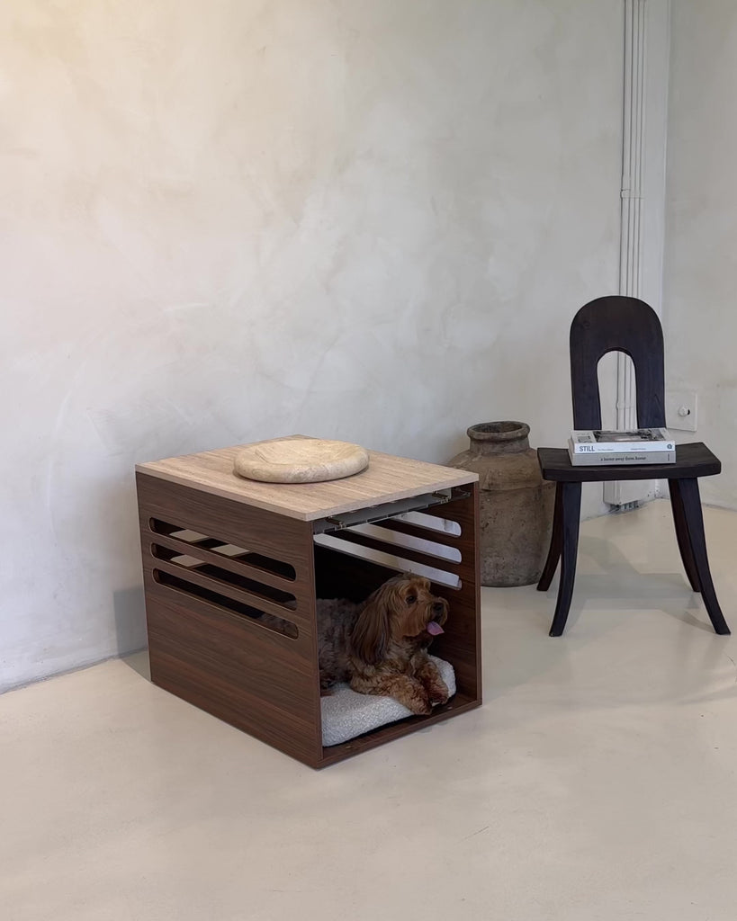 The Koozi Crate is more than just a dog crate—it’s a high-quality, multifunctional furniture piece that combines a stylish side table with a comfortable retreat for your dog.